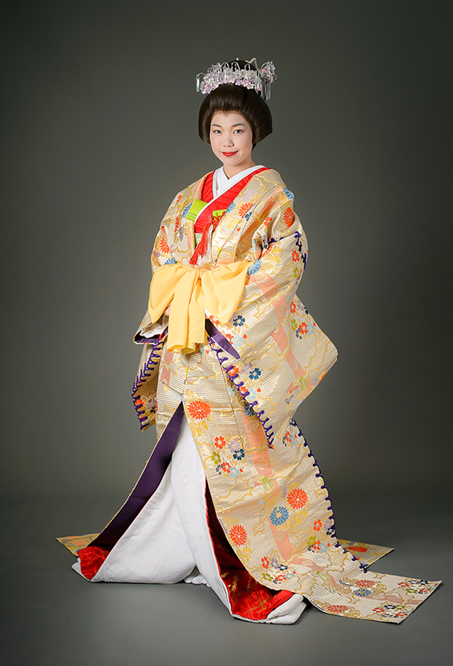 同じ文様の引振袖と打掛を重ね着する大変豪華な姿。